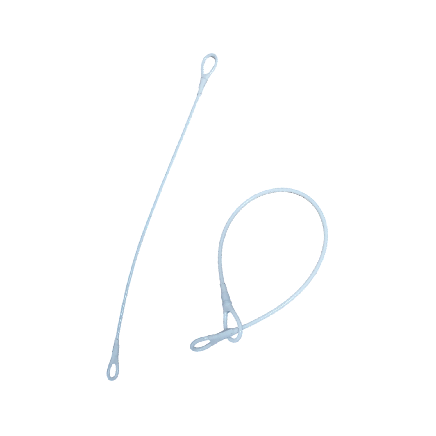 Cable de acero utilizado en conjunto con etiquetas duras, para fijar estas a distintos tipos de productos a proteger.
